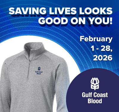 When you donate blood with Gulf Coast Blood this February, you’ll receive a sleek quarter-zip pullover as our way of saying thanks. Every donation helps patients in hospitals get the care they need and keeps our community strong.
