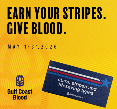 Earn your stripes this summer by making a real impact. Donate with Gulf Coast Blood between May 1–31, 2026, and receive a limited-edition beach towel as a thank-you for helping patients who rely on blood donations every day.